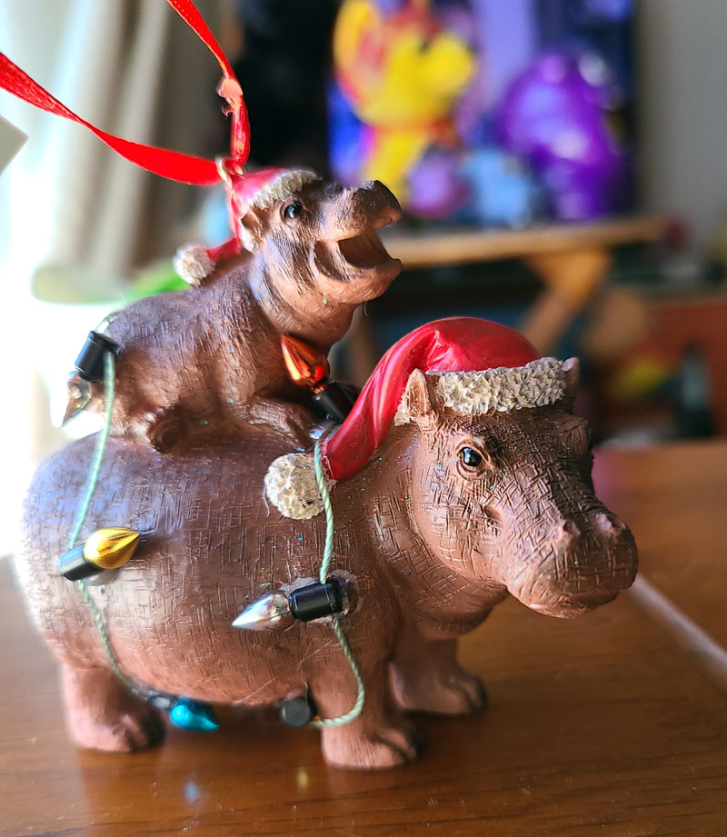 アメリカに住んでいる友人からのお土産です。親子のカバがかわいいです。シンシナティー動物園のフィオナがモデルかな~。サンタの帽子なので、アメリカのクリスマス飾りなのかな~。赤いリボンでつるす…
