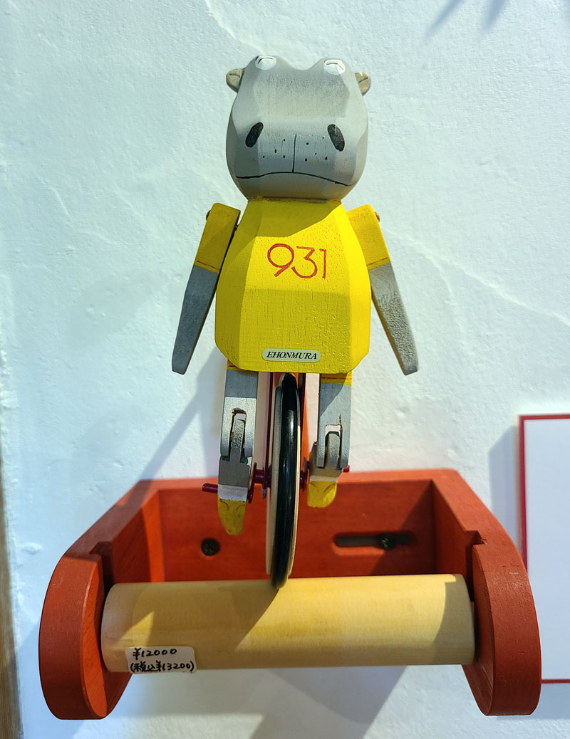 山梨県北杜市にある「えほん村」の売店で保護しました。在庫限りということです。トイレットペーパーホルダー・サイクリングマンで、紙が回るとカバが自転車をこぎます。いろんな動物のサイクリングマンが…