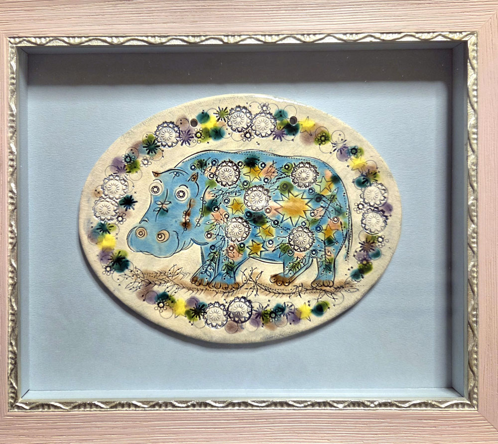 船戸あやこさんの作品。スペインタイルのカバです。船戸さんはスペインでタイルアートを学び、創作活動をしています。静岡市の伊勢丹で催された個展で保護しました。美しい青が特徴のカバ。花模様の…