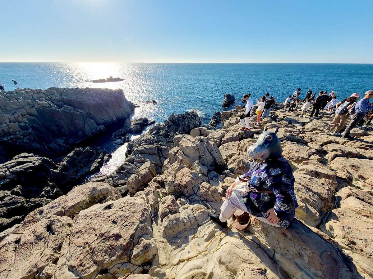 ついに追い詰められたカバ。岩の上で物思いにふけります。間もなく刑事が来るでしょう...というサスペンスドラマによく使われていた東尋坊です。カバは初めて東尋坊に来ました。溶岩でできた岬です…